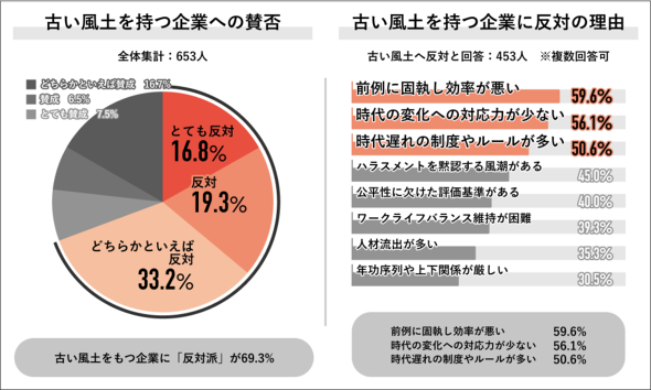 反対の理由としては、59.6%が「前例に固執し効率が悪い」と回答。その他「時代の変化への対応力が少ない」(56.1%)、「時代遅れの制度やルールが多い」(50.6%)、「ハラスメントを黙認する風潮がある」(45.0%)などが挙げられた。