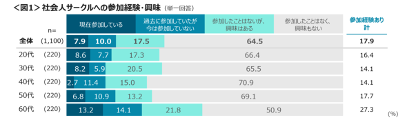 社会人サークルへの参加経験がある人は17.9%。現在参加している人は7.9%だった。60代で「現在参加」が1割を超え、他年代と比べ高くなった。40〜50代は「興味がない」が約7割に上った。