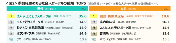 参加経験のある社会人サークルの種類は、男性は「2人以上で行うスポーツ系」「1人で行うスポーツ系」など体を動かすものが上位に、女性は「言語・国際交流系」「室内趣味系」などが上位となった。