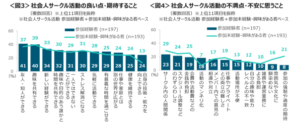 社会人サークル活動の良い点・期待することは、「友人・知人ができる」「趣味を共有できる」「新しい経験ができる」がトップ3となった。