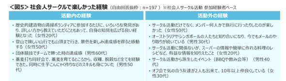社会人サークルで楽しかった経験は、異業種・異世代との交友関係が広がったことや、新たな知識・スキルが身についたこと、などといった意見が挙がった。