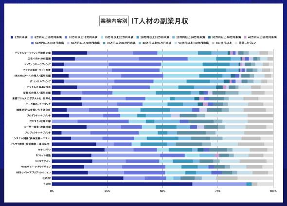 2位は「プロジェクトマネジメント」(43.3%)、3位は「プロダクト戦略立案」(42.1%)、4位は「インフラ構築(設計構築〜運用保守)」(40.0%)、5位は「ユーザー調査・改善提案」(34.3%)だった。デジタルマーケターやシステムエンジニアに比べ、PdM(プロダクトマネージャー)やインフラエンジニアの副業月収の方が高い傾向があるようだ。