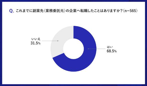 次に、副業経験のあるIT人材に対し、副業先(業務委託元)の企業に転職したことがあるかを尋ねた。「ある」と回答した人は68.5%、「ない」と回答した人は31.5%だった。