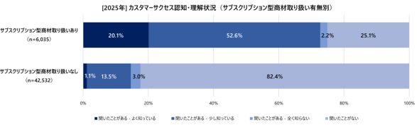 カスタマーサクセスの認知度は、その企業が取り扱う商材によって左右される可能性がある。「サブスクリプション型(サブスク)」商材の取り扱い有無別でその認知・理解割合を見たところ、サブスク商材の取り扱いがある層の20.1%はカスタマーサクセスをよく知っている反面、25.1%の人は「聞いたことがない」と回答。
