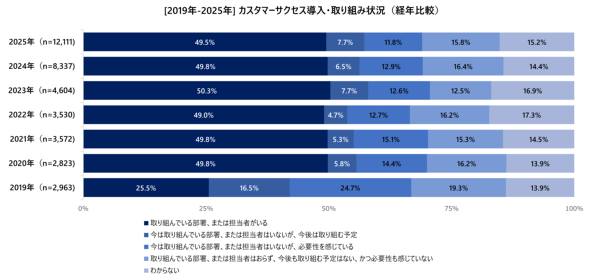 調査で「カスタマーサクセスという言葉を認知している」と回答した有職者(約1万2000人)に、勤務先でカスタマーサクセスに取り組んでいるか尋ねたところ、「取り組んでいる部署、または担当者がいる」と答えた人は49.5%と昨年から0.3ポイント減った。