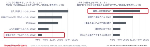 上司層は「周囲から期待されなくなる」「仕事量の偏りによる不満が募る」「連帯感が低下する」などを主な影響として挙げた。一方、静かな退職実践者はいずれも影響として見なしている割合が少なかった。特に、「職場への不満」「連帯感の低下」は上司層と静かな退職実践者とで20ポイント以上の差がある。静かな退職実践者は自身の影響を客観的な視点から把握できていない可能性が示唆される。