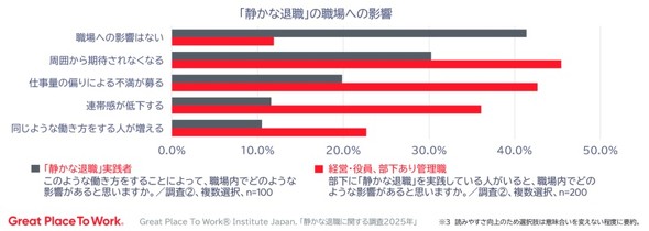 上司層(経営・役員、部下あり管理職)に対して静かな退職の職場への影響を聞き、静かな退職を実践する人の回答と比較した。
