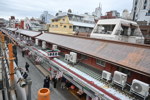 国内外からの観光客でごった返す東京・浅草。雷門を抜けると、全長380メートルの仲見世商店街が真っすぐと浅草寺まで続く。この商店街の屋根材が、戦後初となる80年ぶりの全面葺(ふ)き替え工事が実施されることになり、約10カ月をかけてこのほど竣工を迎えた。