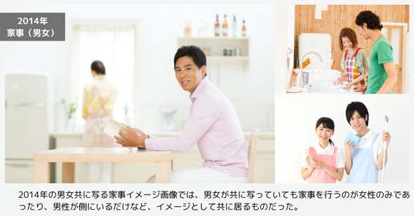 それによると、男女がともに家事をするイメージ写真の数は4倍に増加したが、「男性のみが家事をするイメージ」は依然として売れ筋上位には入っていないことが分かった。ビジネスについては女性管理職のイメージ画像数が3倍に増加しているが、男性の管理職イメージのほうが女性の2.2倍多く、依然として「管理職=男性」の意識が強い傾向にあった。