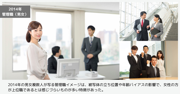 男女混合の管理職イメージを比較すると、2014年は立ち位置や座り位置、被写体の年齢差によるバイアスの影響で、男性が上位職に見える構図が多かった。