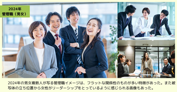 一方、2024年は構図を見ても男女で役職の上下を感じさせるものが少なく、関係性がフラットに見える画像が多い特徴が挙げられる。2024年は女性がリーダーシップを発揮していると見えるものも散見され、「10年前と比較すると、女性の管理職イメージの向上・浸透がうかがえる」(同社)