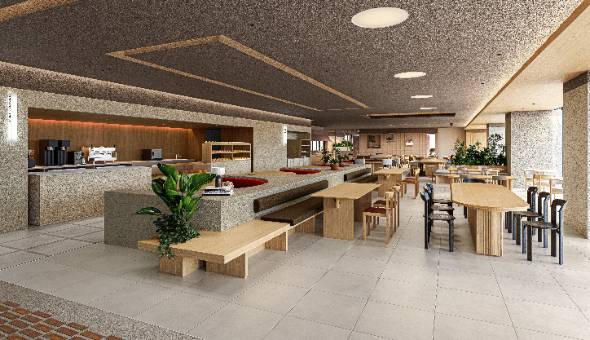 TOFROM YAESU TOWERの13階には、従業員のサポート機能を持つ共用スペース「Wab.」を整備する。こだわりの食を楽しめる食堂・カフェ&バー、リラックスや集中を促す個室ブース、多様な過ごし方ができるラウンジ、交流を生むイベントスペースなど、多彩な機能を備えた空間を提供する。