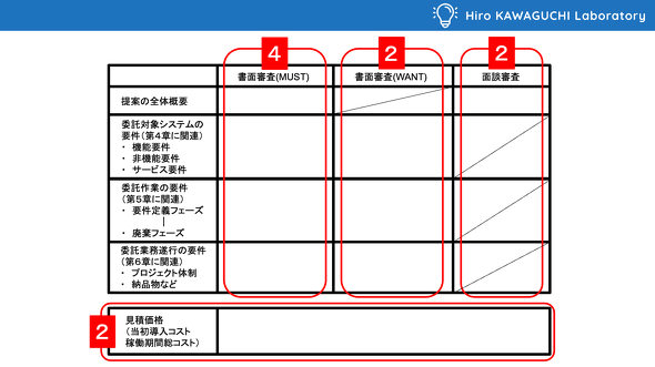 そこで、必須要件はどの事業者も満点を取ってくることを前提として、必須要件を満たしていない提案は、その審査項目にのみ配点を行わない(0点とする)ようにすることで、評価を下げるという手法を採用しています。そのためには必須要件に相応の配点がないと、評価を下げる効果が働かないのです(もちろん、特定の事業者に有利、不利な調達仕様書を作成しないことが前提となります)。