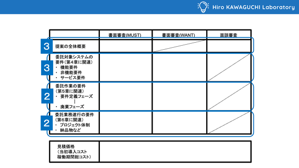 また、可能な限りそれぞれの審査項目は定量的に評価できるようにするべきです。この具体的な方法については、次回以降ご説明しましょう。