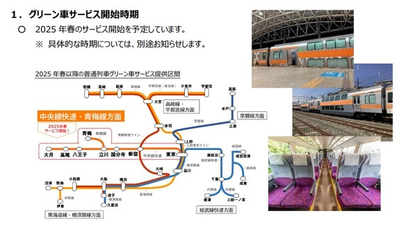 導入初期は、グリーン車なしの編成とグリーン車付きの編成が混在するため、「お試し期間」として正式運用開始前の2025年3月14日まではグリーン車の料金が無料となった。ダイヤ改正が終わる翌15日から中央快速線のグリーン車が正式にサービスを開始する。この日からは、アテンダントが乗車し、グリーン車内のトイレも使用可能となる。