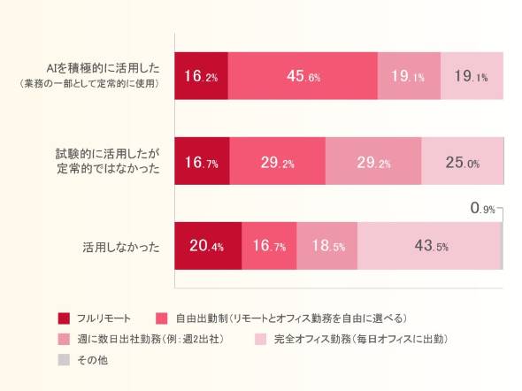 勤務体系については、「AIを積極的に活用した」層では「自由出勤制(リモートとオフィス勤務を自由に選べる)」が45.6%と最も多かった。一方、「活用しなかった」層では、「完全オフィス勤務(毎日オフィスに出勤)」が43.5%で最多となり、柔軟な働き方の導入状況に差が出ている。