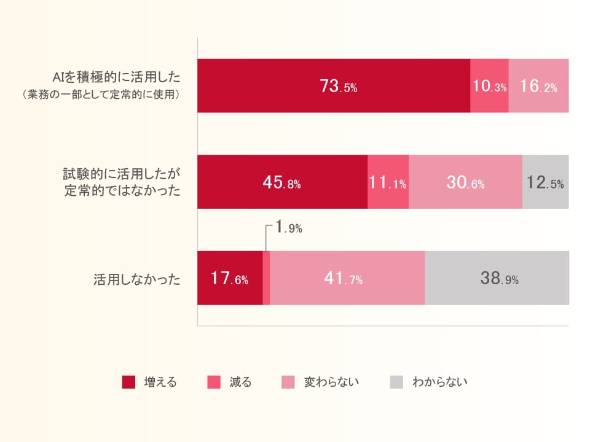 2025年にAIの業務活用が増えると思うかについては、「AIを積極的に活用した」層の7割以上が「増える」と回答した。すでにAIを活用しているITエンジニアほど、AIの将来性を見据えていることがうかがえる。