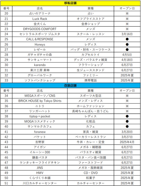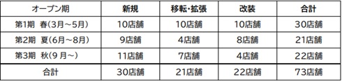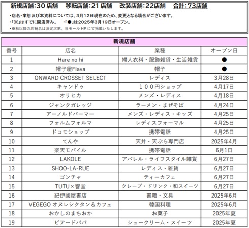 飲食店ではラーメン店「ジャンクガレッジ」が4月24日、天丼・天ぷら専門店「てんや」が4月、韓国の家庭料理店「VEGEGO オヌレシクタン&カフェ」 が6月に、それぞれオープンする。