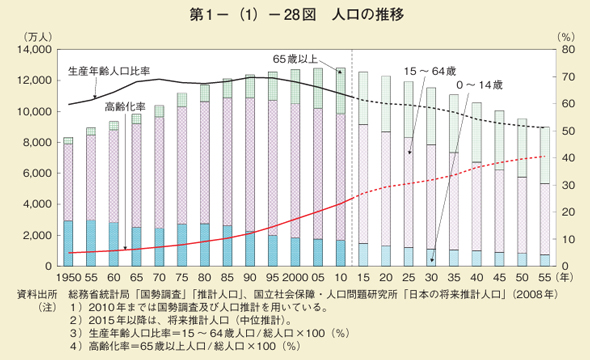 会社経営に影響があるのは、15〜64歳という「生産年齢人口」であることは言うまでもない。これは1995年をピークに減少。全人口に占める生産年齢人口比率も、1990年の69.5%をピークに低下しているのだ。