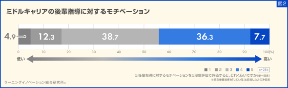 最も多かったのは「3」(38.7%)で、「2」(12.3%)、「1」(4.9%)という回答も見られた。後輩指導に関わる全ての中堅社員が意欲的に取り組んでいるわけではないことが明らかになった。