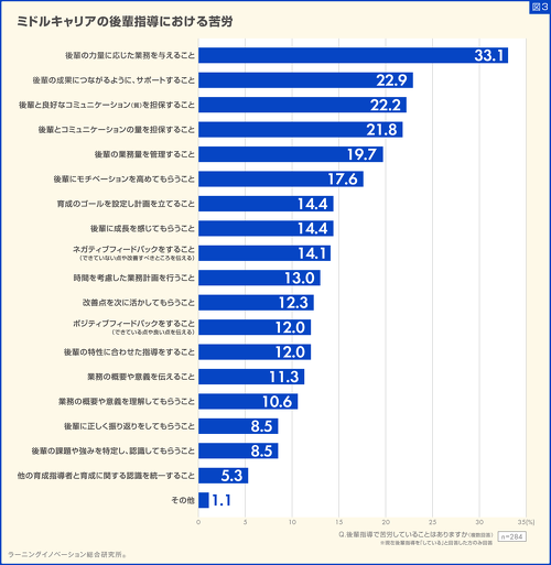 最も苦労している項目として挙げられたのは「後輩の力量に応じた業務を与えること」(33.1%)だった。2位の回答と10ポイント以上の差をつけた。以降「後輩の成果につながるように、サポートすること」(22.9%)、「後輩と良好なコミュニケーション(質)を担保すること」(22.2%)と続いた。