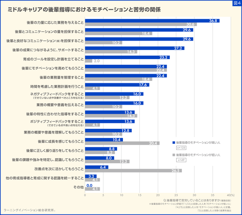 後輩指導におけるモチベーションと苦労の関係性も調査した。後輩指導のモチベーションを「4」「5」と回答した群と、「1」「2」と回答した群で比較したところ、前者の苦労としては「後輩の力量に応じた業務を与えること」(35.8%)、「後輩とコミュニケーションの量を担保すること」「後輩と良好なコミュニケーション(質)を担保すること」(同率29.6%)などが挙げられた。