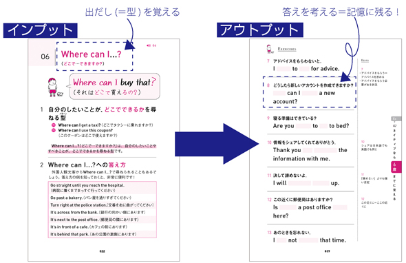 各型をインプットした後は、その型を定着させるための問題を掲載。穴埋め式で正解を考えることで、記憶に残りやすく、定着しやすいトレーニングになっている。「繰り返し練習することで、英語が自然に口から出てくる感覚を養い、実践的な英語力を身に付けられる」(同社)