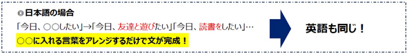 英会話の導入部分はパターン化されていることが多く、例えば「I want to〜」や「I like〜」といった決まったフレーズがあり、まずその「型」を覚えることで、実際の会話でもスムーズに話し始められるという。「その型をネイティブの子どもが覚える優先度の高い順に並べたことが、本書のコンセプトにつながっている」(同社)とコメントした。