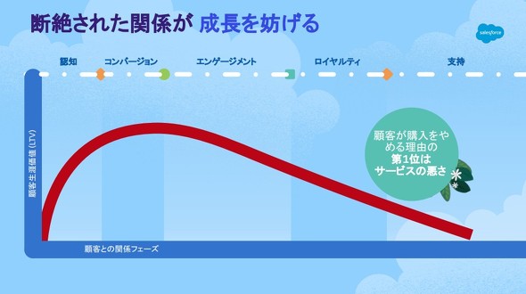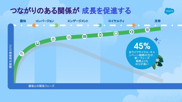 「顧客の81%が、企業とたった一度の接点ではなく、末永くつながっていきたいと考えている」──と、セールスフォース・ジャパン 専務執行役員の三戸篤氏(製品統括本部 統括本部長)は説明。新規顧客獲得、初期の認知拡大にばかり執着していては、「既存顧客と企業、ブランドとのつながりが希薄になり、結果的にLTVの低下につながってしまう可能性がある」と三戸氏は指摘する。