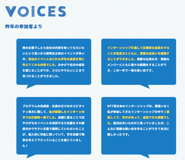 「自分が本気で取り組める仕事を見つけることができた」というお礼の連絡や、「NTT東日本のインターンシップに参加することで自身の納得する就職活動を送ることができた」といった感謝のこめられた辞退連絡も増えたという。同社がファーストキャリアでないとしても、長期的なファンの獲得としても有用だ。
