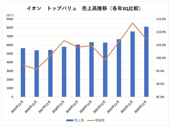 しかし、値上げラッシュが本格化した2023年以降は急拡大している。トップバリュに関しては、物価高騰が本格化した時期から価格据え置きをうたい、積極的な浸透を図ったことが奏功した。その結果、多くの人が手に取るようになり、品質のよさが消費者に浸透しつつあるようだ。