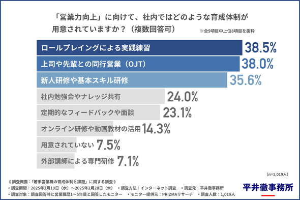 営業力向上に向けて、社内ではどのような育成体制が用意されているのか? 最も多かったのは「ロールプレイングによる実践練習」(38.5%)だった。以降「上司や先輩との同行営業(OJT)」(38.0%)、「新人研修や基本スキル研修」(35.6%)と続いた。