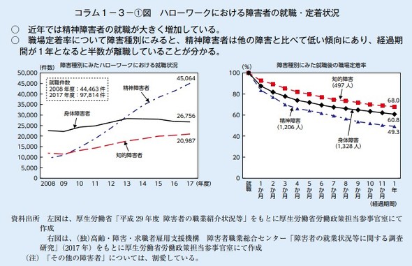 特に近年は精神障害者の雇用が大幅に増加しているが、他の障害のある人と比べて定着が難しい傾向にある。就業1年後の定着率は知的障害者が68.0%、身体障害者が60.8%に対し、精神障害者は49.3%だったという調査報告もある(独立行政法人高齢・障害・求職者雇用支援機構 障害者職業総合センター「障害者の就業状況等に関する調査研究」)。