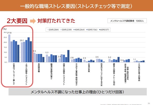 メンタル不調の従来の主要因は「仕事の大変さ」と「上司との関係」であり、長時間労働規制やパワハラ対策で取り組みが進んできた。