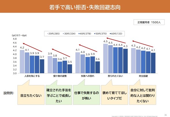 また「拒否・失敗回避志向」についての調査では、若い世代ほど「人目を気にする」「褒めて育ててほしい」「批判的な人との関わりを避ける」傾向が強いことが判明。「マニュアル的に成長したい」「失敗を恐れる」という受け身の姿勢も20代で顕著だ。