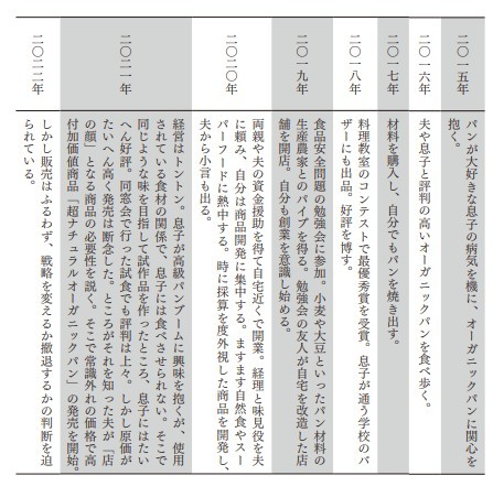 例えば「超ナチュラルオーガニック食パン」の場合、五十鈴さんはパンづくりに興味を抱き始めた年から、1年ごとの年表を書き起こすことにしました。