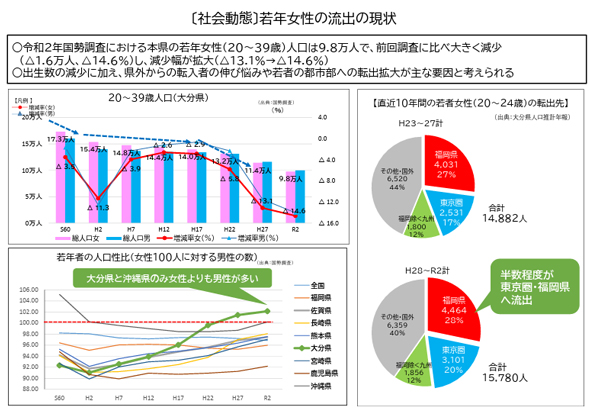 まず、大前提の事実として大分では若者の人口が急激に減少している。例えば令和2年(2020年)国勢調査における大分県の若年女性(20〜39歳)人口は9.8万人。前回5年前の調査が11.4万人なのでガクンと減っている。もちろん、この傾向は男性も同じだし、他の世代も減っている。
