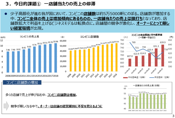 「コンビニ全体の売り上げは増加傾向にあるものの、一店舗当たりの売り上げは頭打ちとなっており、店舗数拡大で利益を上げるビジネスモデルは転換点に。店舗間の競争が激化し、オーナーにとって厳しい経営環境が出現」(第1回 新たなコンビニのあり方検討会事務局説明資料より)