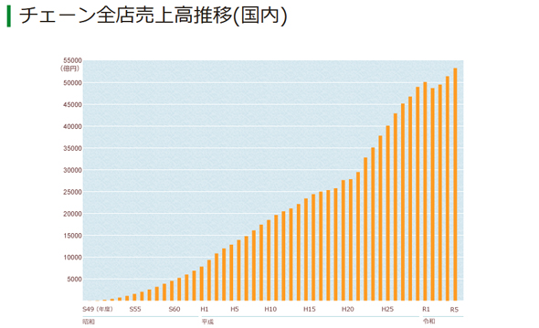 「24時間営業問題」やコロナ禍もあって、翌2020年の売り上げは大きく落ち込んで4兆8706億円に。そこから店舗数が増えていくのと同じく業績も右肩上がりで増えて、2023年には5兆3452億円とまでなっている。