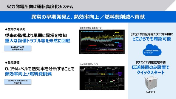 TOSHIBA SPINEX for Energyは、多くの具体的なユースケースでその価値を発揮している。例えば火力発電所向けには故障予兆検知や性能評価システムを提供していて、これによって稼働率向上や燃料費削減を可能にした。また太陽光発電所向けには、複数拠点の稼働状況を集中監視するクラウドサービスがあり、効率的な管理業務を実現している。