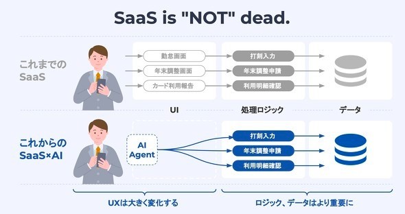辻CEOが描くビジョンの根底にあるのは「DX(Digital Transformation)からAX(AI Transformation)へ」という大きな転換だ。「DXは人がITやクラウドを活用することによって業務を効率化する変革だが、AXはAIが自律的に動いて業務を変革していく」と辻CEOは説明する。つまり、人間がSaaSツールを操作するという従来のモデルから、AIがデジタルワーカーとなって自律的に業務を遂行する新時代の到来を見据えているのだ。