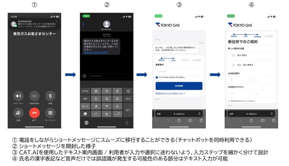 大手エネルギー企業である東京ガスでは、ガスの開閉栓受付を自動化しました。このような生活インフラの開通は引っ越し繁忙期に集中することに加え、契約者名(漢字)や建物名の正確な聴取が求められます。そこで、電話(ボイスボット)で問い合わせを受けてから、ショートメッセージに移行し、チャットボットの質問に答える形で住所氏名などをテキスト入力してもらう──という顧客体験の流れをデザイン。住所の入力は、ユーザーが入力や選択に迷わないよう、細かく分けて提示するようなステップを追加して設計しました。