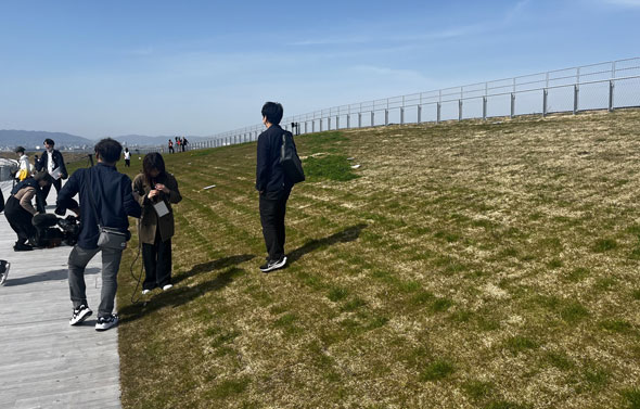 芝生は東側の一部に設けられていますが、全周2キロの中で、なぜここだけなのでしょうか。東側にあるということは、正面が西側になるので、反対側のリングに向かって夕日が落ちていく。また、天気がよければ、瀬戸内海の海水面が見える。そうした光景を転がりながら楽しんでもらうために、この部分だけ芝生を設けたそうです。
