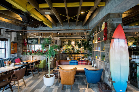 「いちばん近いハワイ」をコンセプトに掲げる店内には、カラフルなハワイアン雑貨やサーフボードのほか、ハワイの自宅にいるようなインテリアを設置している。どの店舗も行列ができる人気ぶりで、時に3時間待ちになることもある。