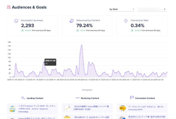 トヨクモのコンテンツマーケティングを特徴づけるのは、徹底したデータドリブンなアプローチです。私たちは、TRENDEMONのようなツールを活用してコンテンツのパフォーマンスを詳細に分析しており、読了率、サイト内での回遊状況、コンバージョン率などをコンテンツごとにモニタリングしています。