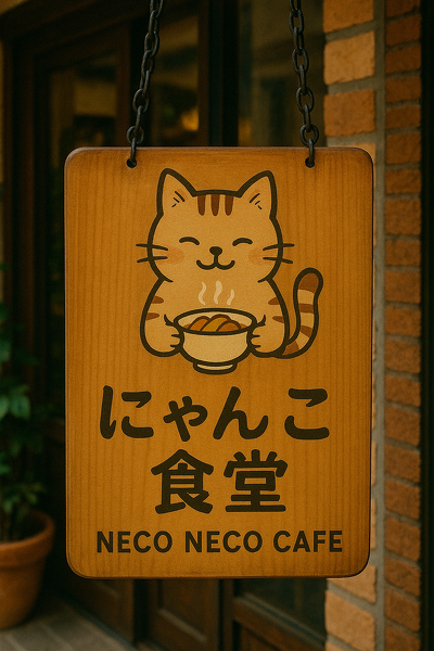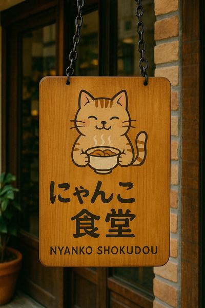 例えば「猫カフェの店先に『にゃんこ食堂』と書かれた看板がある写真を生成して」とプロンプトに書けば、下図のように日本語テキストもはっきり読める画像が得られます。実際、以前では困難だった日本語の看板表現が、現在では自然な筆文字風に再現されています。