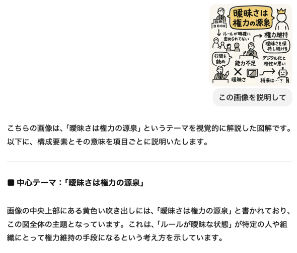 と指示するだけで、画像に書かれていることを読み取り、そこから何が説明できるのかを回答してくれます。