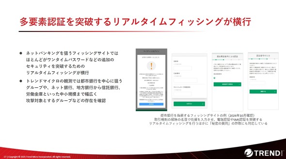 詐欺サイトの精巧さも進化し、かつてのようにURLや画面レイアウトの違いで見分けることは困難になっている。都市銀行を偽装したフィッシングサイトの中には、取引規制の解除を名目に情報を入力させ、電話認証やSMS認証を突破するリアルタイムフィッシングに対応しているものもある。