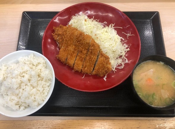 カツ丼(梅)は会計時にもらう100円割引券を使うと、ワンコインで食べられるのが魅力だった。今でも十分に安いが、牛丼と同様にやはりワンコインの壁が崩れてしまった。ロースカツ定食は100円割引券を使うと、まだ700円を切る。昨今の物価高を考慮すると、頑張っている方だ。
