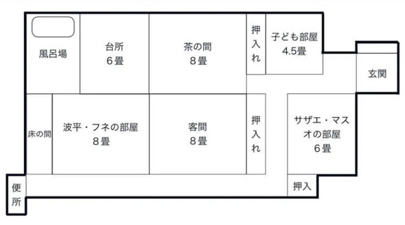 カツオとワカメの部屋は2人で4.5畳、サザエ・マスオ・タラちゃんの部屋は3人で6畳である。「子どもたちが大きくなったら、どうするの?」と突っ込みたくなるが、狭いのにはちゃんと理由があった。「客間」の存在だ。